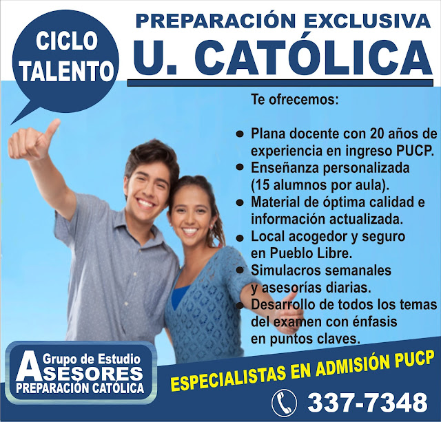 Somos el único grupo de estudio preuniversitario exclusivo para postulantes a la Pontificia Universidad Católica del Perú que ofrece una auténtica preparación personalizada virtual y que cuenta con el Equipo Docente con más de 25 años experiencia en el ingreso a la PUCP. Nuestro sistema de enseñanza no solo permitirá tu óptimo aprendizaje sino te dará la base suficiente para permanecer en la universidad. Porque en ASESORES Y CONSULTORES ACADÉMICOS ESTAMOS 100% DEDICADOS A LOGRAR TU INGRESO.